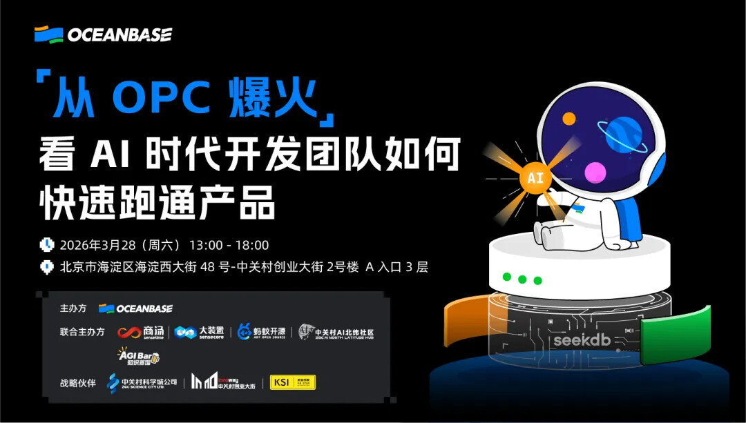 与其焦虑,不如亲身走进风暴中心。本次活动由 OceanBase 携手商汤大装置、蚂蚁开源、中关村 AI 北纬社区 与 AGI Bar 联合发起,战略伙伴中关村科学城公司、中关村创业大街及氪星创服提供支持。这场聚焦 AI 实战与开发者未来形态的活动,将带大家走进真正的 AI 实战现场。