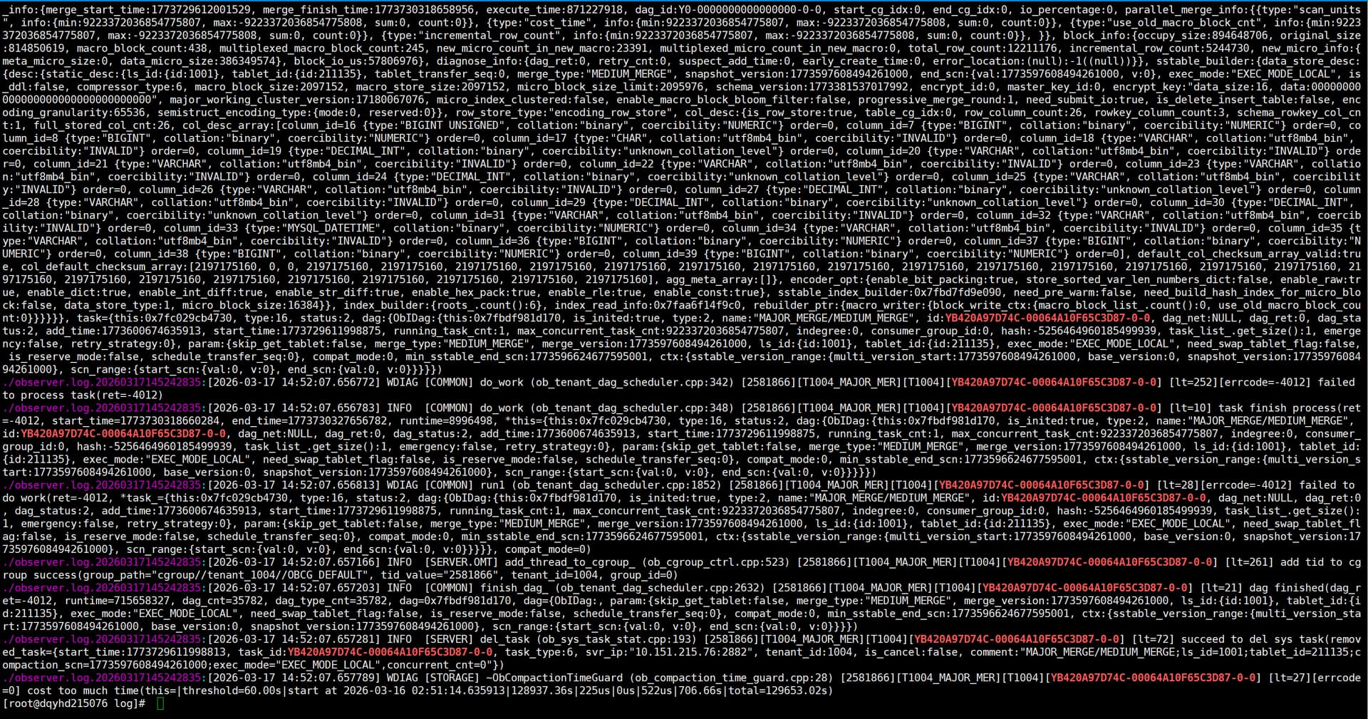 error_no=-4012,last_error_time=1773730327657309,error_trace=YB420A97D74C-00064A10F65C3D87-0-0,location=ob_tablet_merge_info.cpp:196(create_sstable),warning=“MAJOR_MERGE/MEDIUM_MERGE;ls_id=1001;tablet_id=211135;compaction_scn=1773597608494261000;exec_mode=“EXEC_MODE_LOCAL”,concurrent_cnt=6”