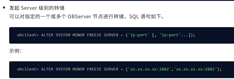 【问题描述】ALTER SYSTEM MINOR FREEZE SERVER = (‘ip:port’ [, ‘ip:port’…]);
