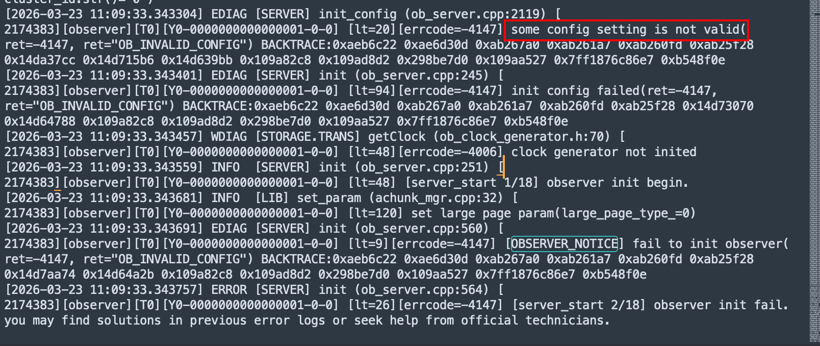 [2026-03-20 16:29:30.444287] ERROR [SERVER] init (ob_server.cpp:564) [1196313][observer][T0][Y0-0000000000000001-0-0] [lt=24][errcode=-4013] [server_start 4/18] observer init fail. you may find solutions in previous error logs or seek help from official technicians.