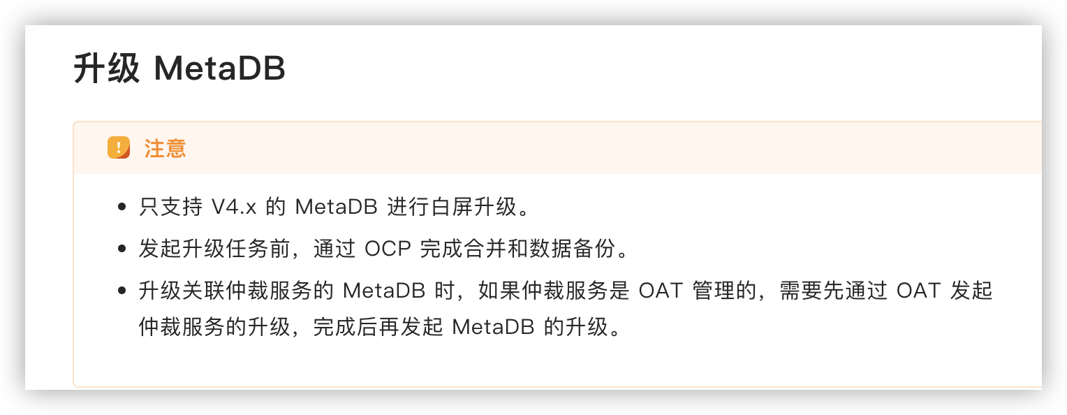 1.企业版环境,oat-v4.3.0版本及以上提供升级metadb的白屏功能。