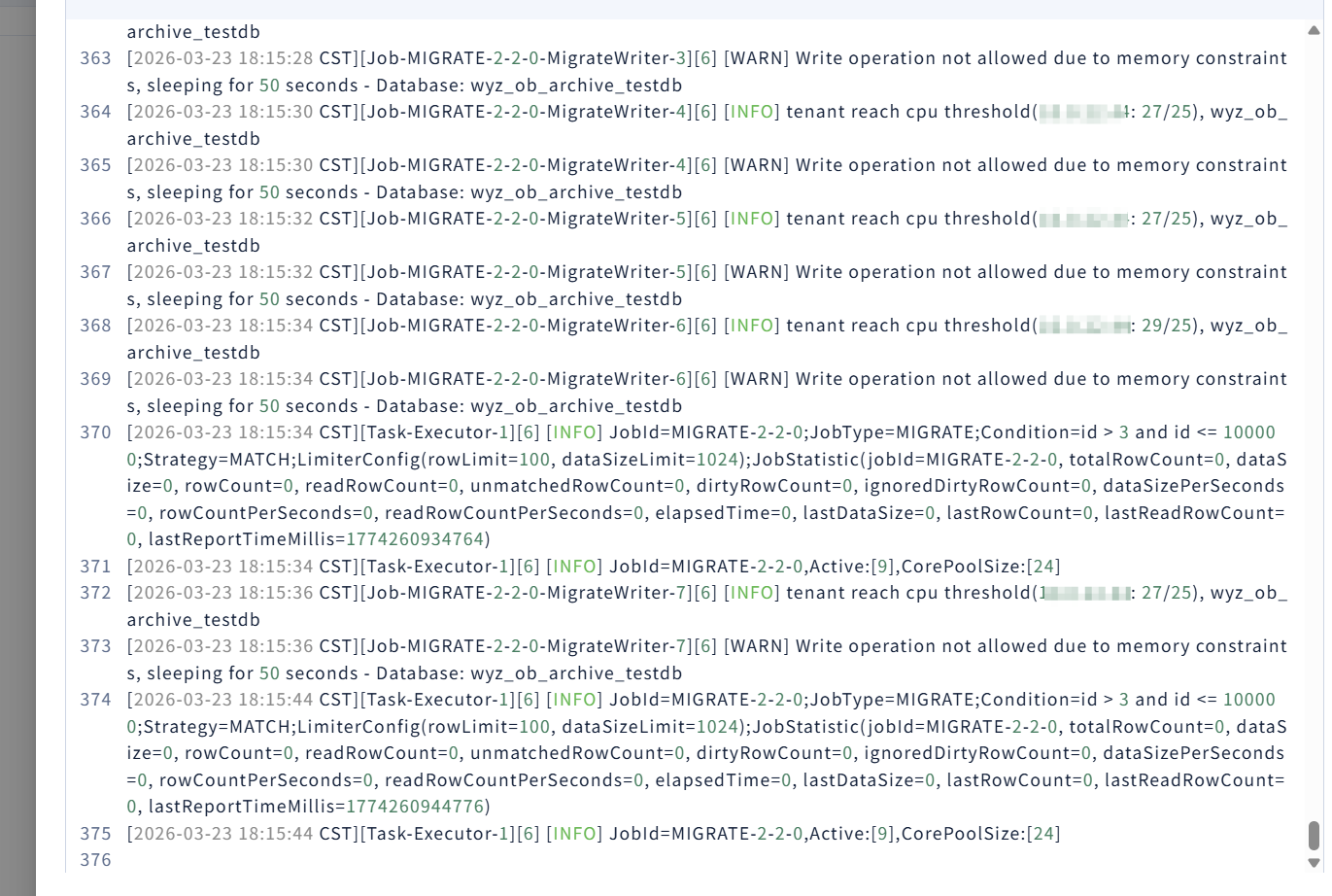 [2026-03-23 17:14:19 CST][Job-MIGRATE-1-1-0-MigrateWriter-7][2] [WARN] Write operation not allowed due to memory constraints, sleeping for 50 seconds - Database: wyz_ob_archive_testdb