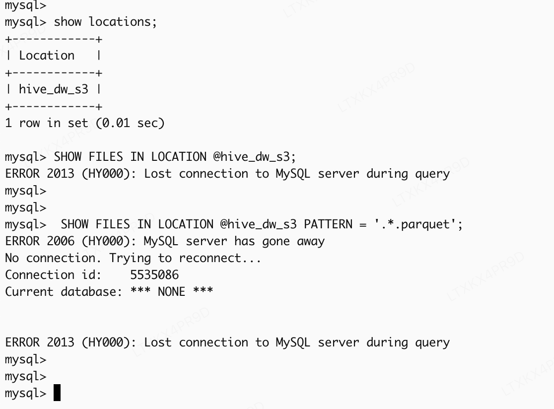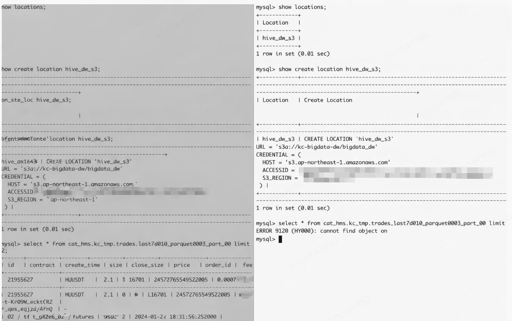 另有一组测试中,创建 LOCATION 使用 s3:// 路径时,查询会报: