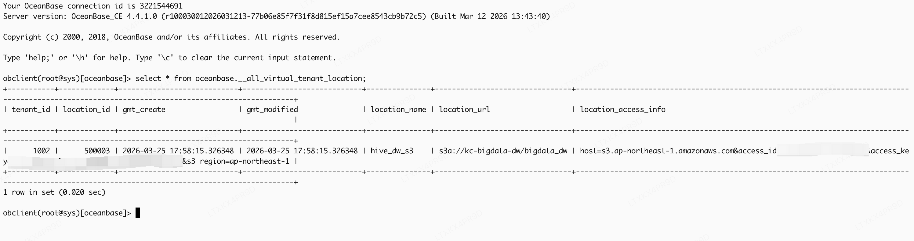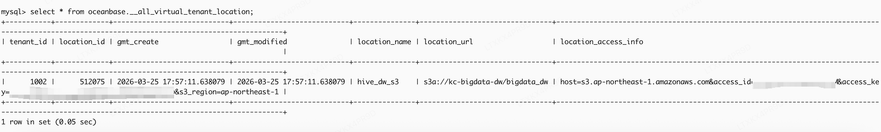 SHOW CREATE LOCATION中还观察到一个异常现象:ACCESSKEY回显被拼接进ACCESSID,类似: