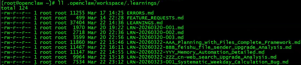 若安装了self-improving-agent技能,在workspace下的.learning文件夹中,还会生成其他md记忆文件: