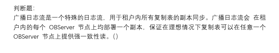 广播日志流是 OceanBase 从 V4.2.0 版本开始引入的特殊日志流,专用于租户内所有复制表的副本同步 。当租户中创建第一个复制表时,系统会自动创建该广播日志流 。其核心特性在于,它会在租户所覆盖的每一个 OBServer 节点上部署一个副本,从而确保在理想状态下,任意节点都能提供复制表的强一致性读服务 。