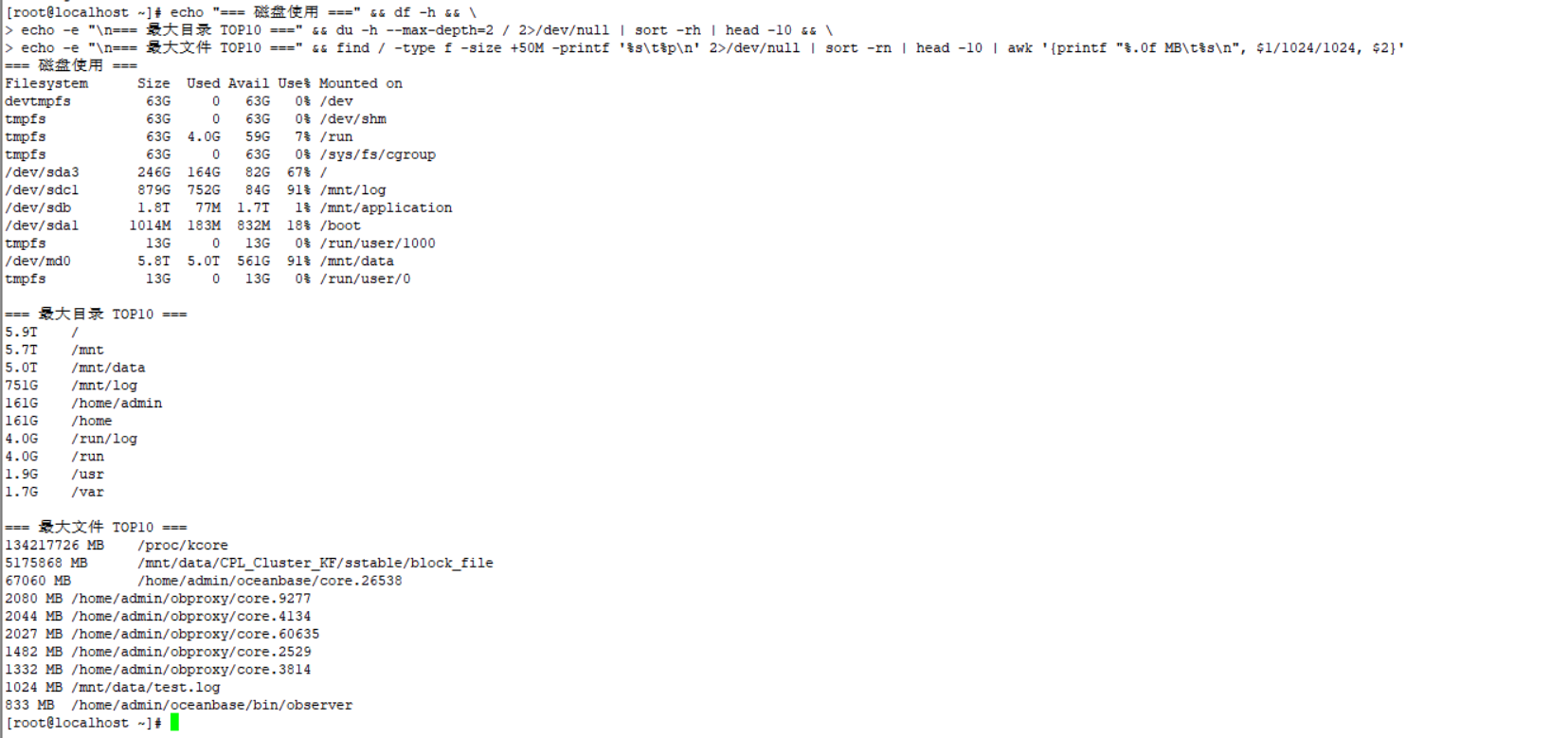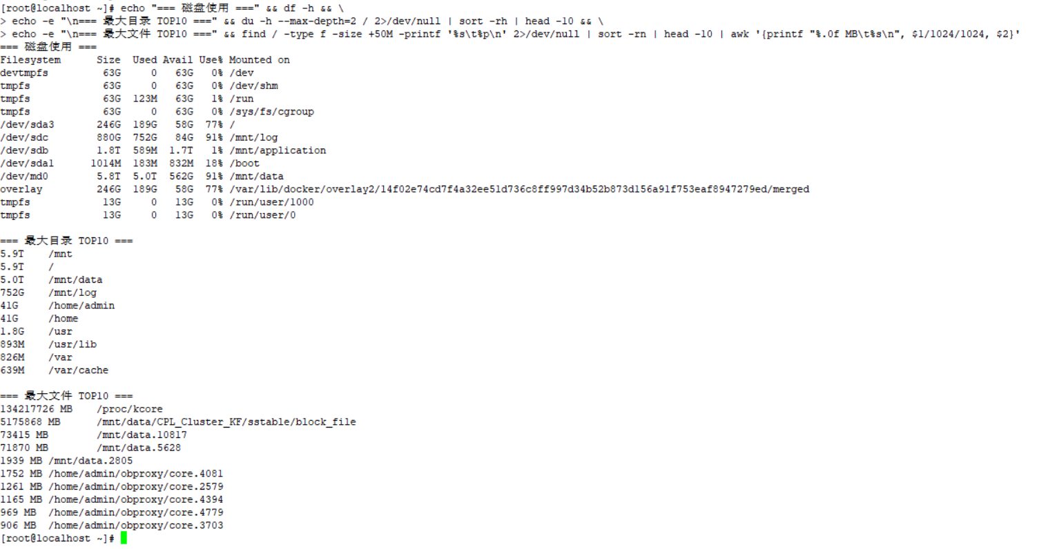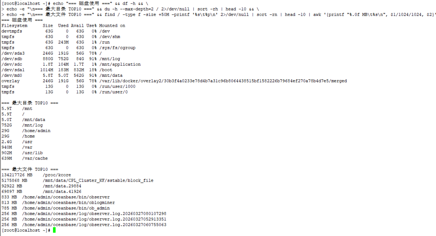 你去操作系统上 df -h 对比下 三个 机器 哪些文件大? 截图发出来