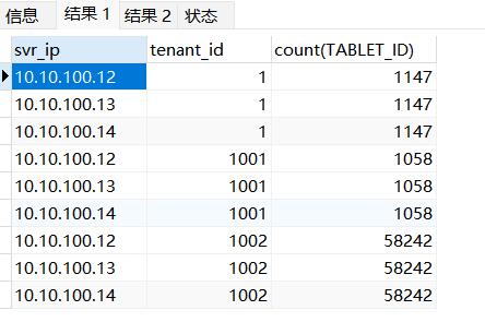 select svr_ip,tenant_id,count(TABLET_ID) from CDB_OB_TABLET_REPLICAS group by svr_ip,tenant_id;