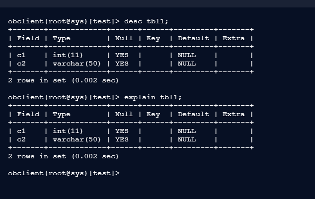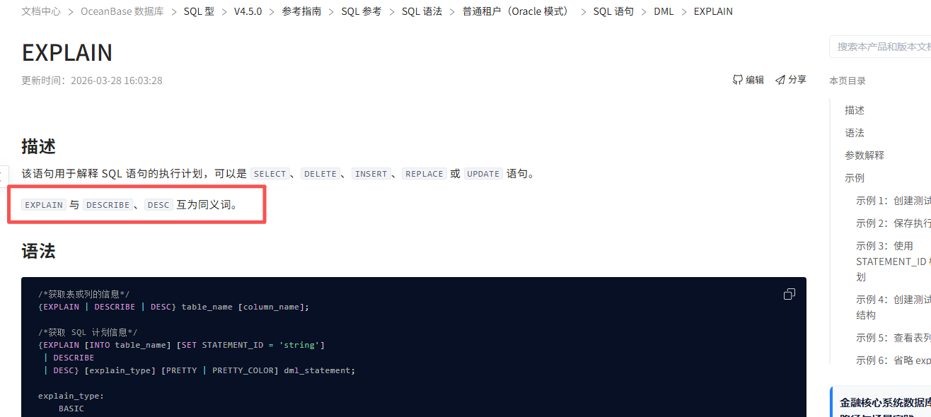 - DESCRIBE(或DESC)用于查看表结构信息;SHOW PLAN不是有效的OceanBase命令;ANALYZE用于收集表和列的统计信息,帮助优化器生成更准确的执行计划。