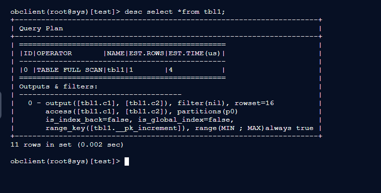- OceanBase的EXPLAIN支持多种输出格式,如EXPLAIN BASIC(精简模式)、EXPLAIN EXTENDED(详细信息)、EXPLAIN OUTLINE(显示Outline信息)等。