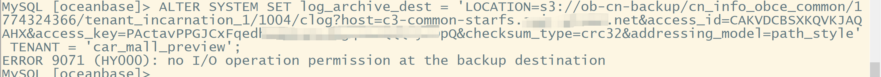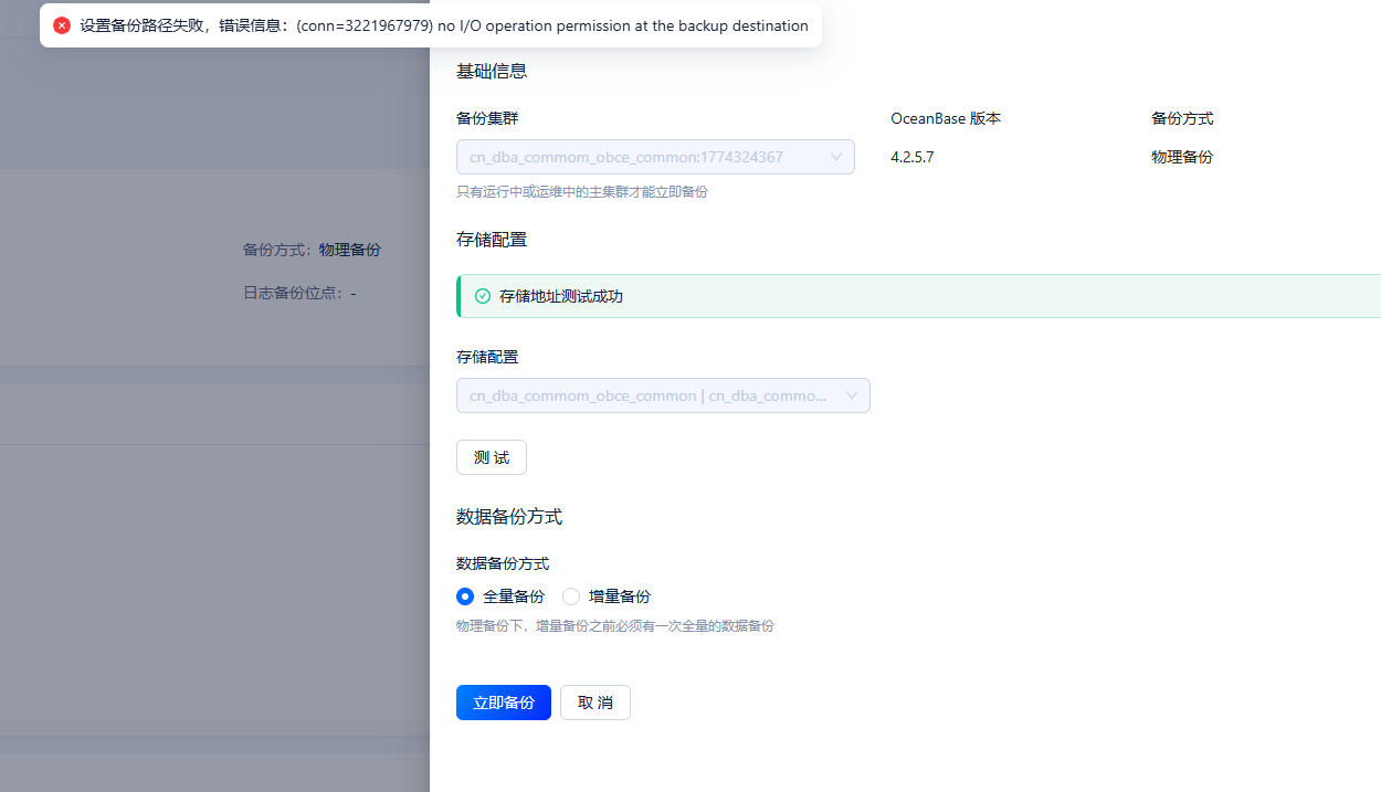 发起备份报错 设置备份路径失败,错误信息:(conn=3221967979) no I/O operation permission at the backup destination