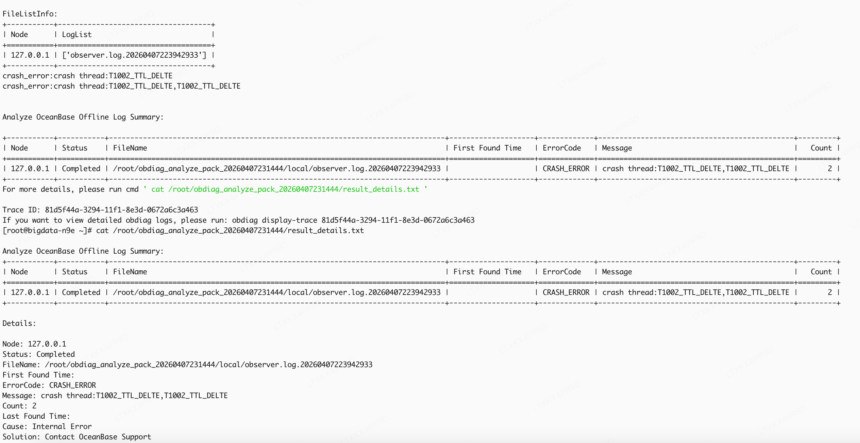 - obdiag 明确识别到 crash 线程为 T1002_TTL_DELTE;