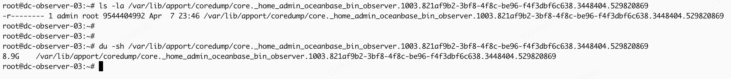 现场排查时,发现 observer 进程已经生成 core 文件,大小约 8.9G,例如: