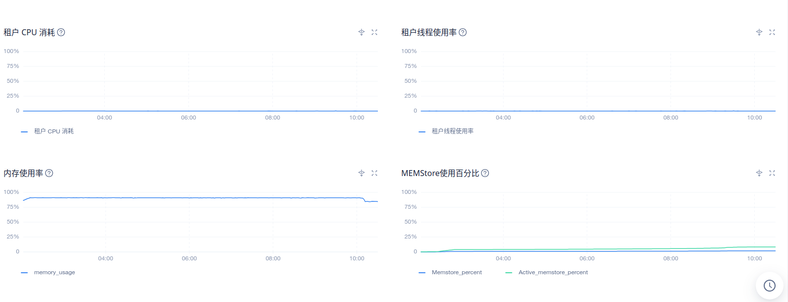 2、在ocp 租户–> 性能监控–>性能与SQL 看下 租户 CPU 消耗,内存使用率
