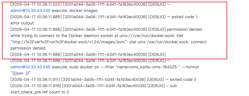 [2026-04-17 10:36:11.686] [3201a044-3a06-11f1-b34f-fa163ec40036] [DEBUG] permission denied while trying to connect to the Docker daemon socket at unix:///var/run/docker.sock: Get “http://%2Fvar%2Frun%2Fdocker.sock/v1.24/images/json”: dial unix /var/run/docker.sock: connect: permission denied