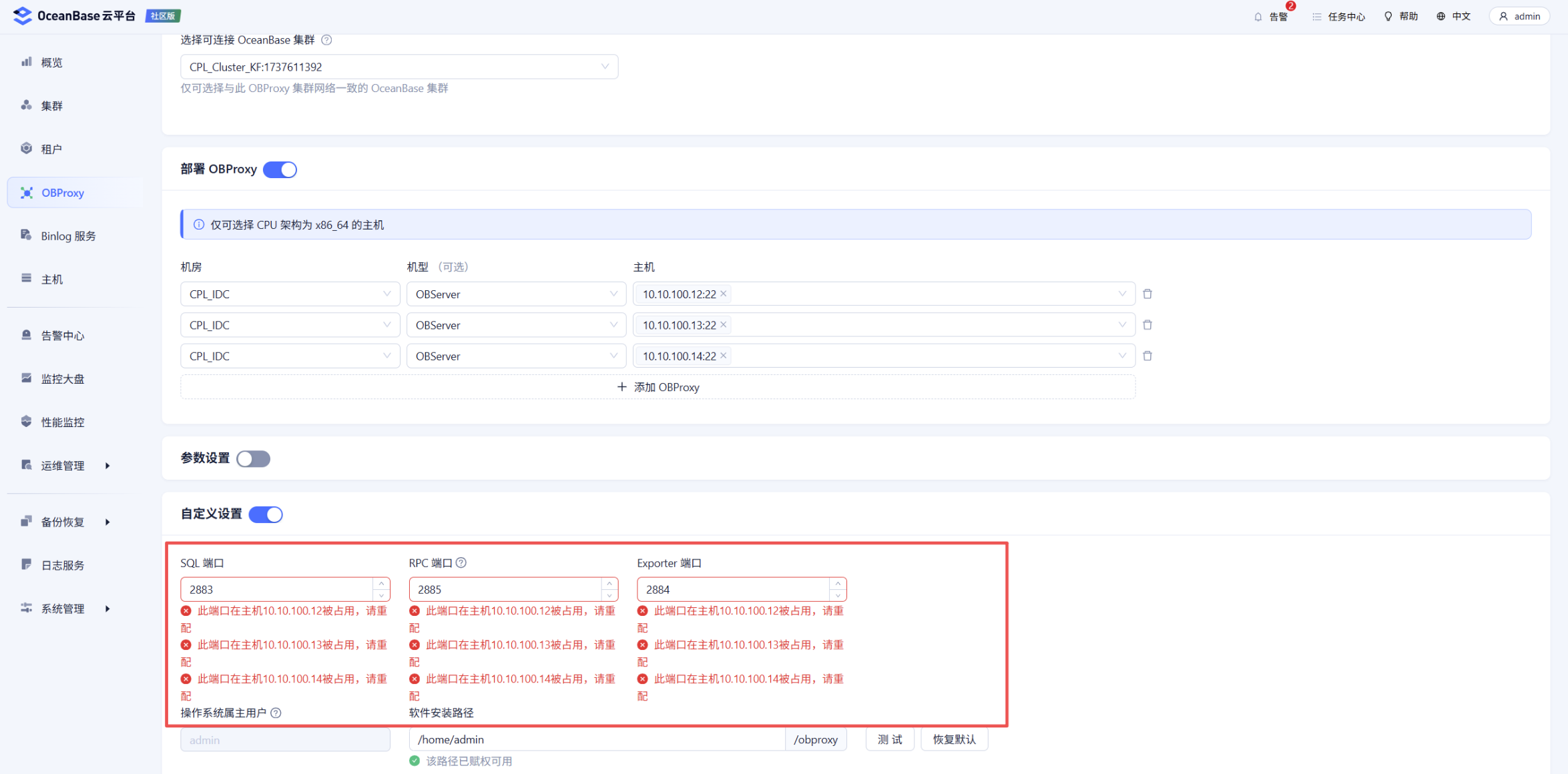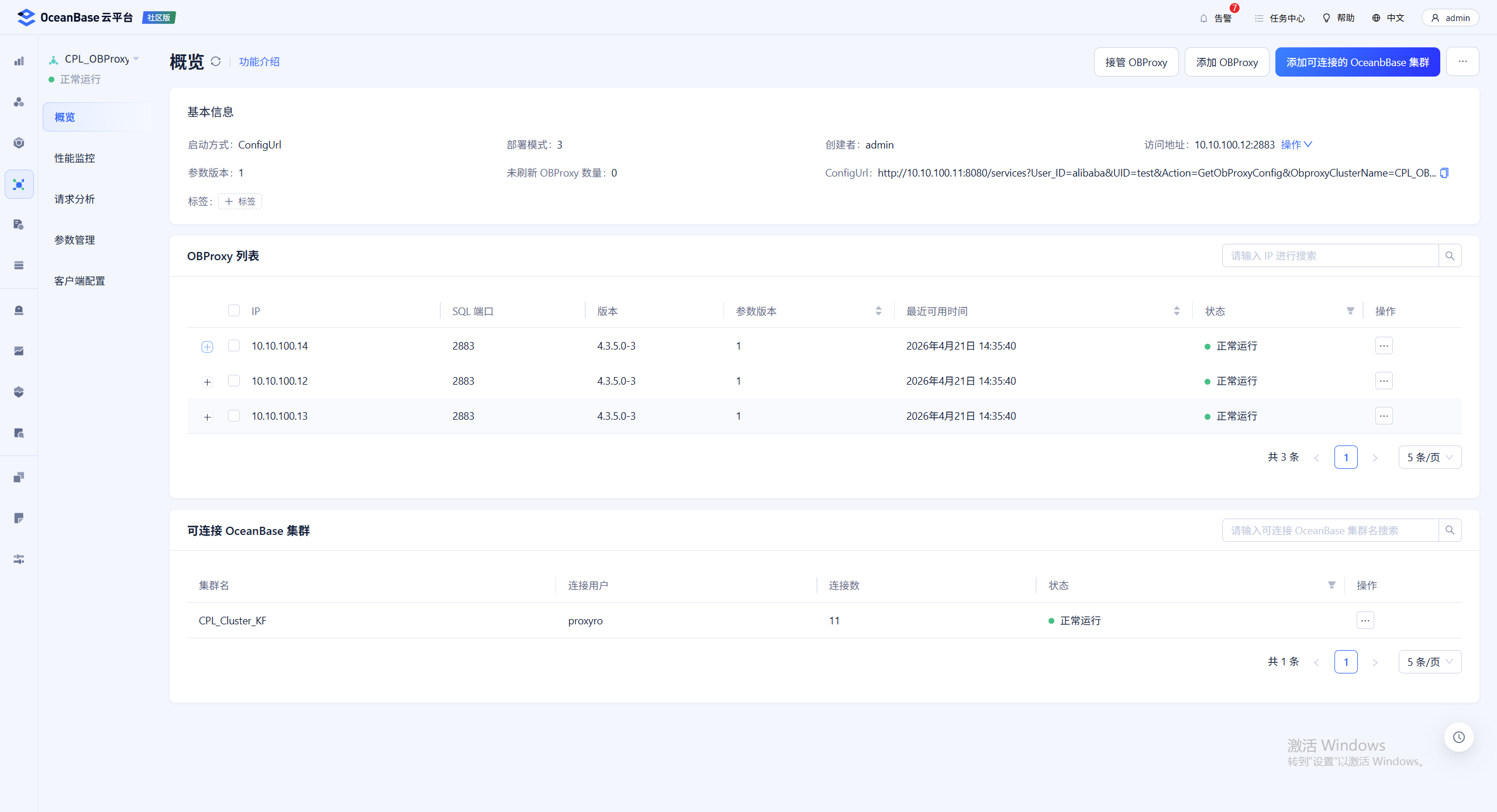 在重装OCP之前,我已经将业务集群和连接业务集群的OBProxy集群都已经迁出了,再在原机器上卸载了OCP,再重新在10.10.100.11机器上安装的OCP,在10.10.100.17机器上安装的MetaDB集群的OBProxy。