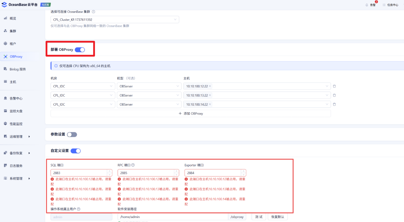 我已按照官方文档,迁出原OBProxy集群,迁出原业务集群,且已在10.10.100.11节点,安装OCP,再10.10.100.17节点安装了OBProxy,且已经接管了业务集群,按照官网文档提示,还需要接管原来的OBProxy集群,但是在创建OBProxy集群的过程中,提示2883、2884、2885端口被占用问题,请老师帮忙指导下,应该如何操作,接管原来的OBProxy集群,看需要如何处理。