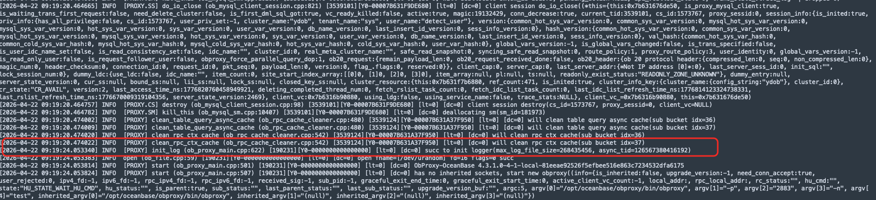 [2026-04-22 09:19:24.053340] INFO [PROXY] init_log (ob_proxy_main.cpp:622) [190231][Y0-0000000000000000] [lt=0] [dc=0] succ to init logger(max_log_file_size=268435456, async_tid=126567380416192)